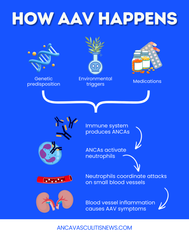 As with many autoimmune diseases, AAV is unpredictable and lacks a single clear cause. It is not easy to predict who will develop the disease. Researchers are still working to better understand what causes autoimmune vasculitis. Some areas of ongoing research include: